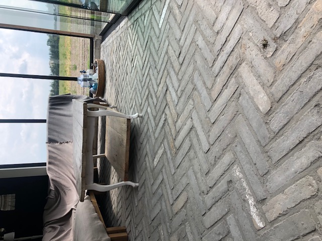 Die Ziegelstreifen werden aus dem alten, gebrauchten Ziegel gesägt. Dabei handelt es sich um die schönen Sichtseiten des Ziegels. Diese Art von Stein ist sicherlich einzigartig, stammt aus Abbruch und verleiht Ihrem Raum eine nostalgische Atmosphäre. Auch mit dieser Farbe können Sie die industrielle Atmosphäre erreichen. Die Kombination aus Holz und Beton sowie schwarzen Stahlrahmen machen die Kombination besonders gelungen. Wärme, darum geht es.